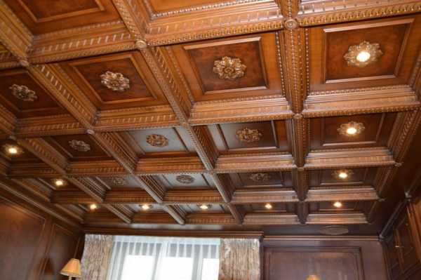 На фото кабинет с деревянным кессонным потолком темного оттенка.