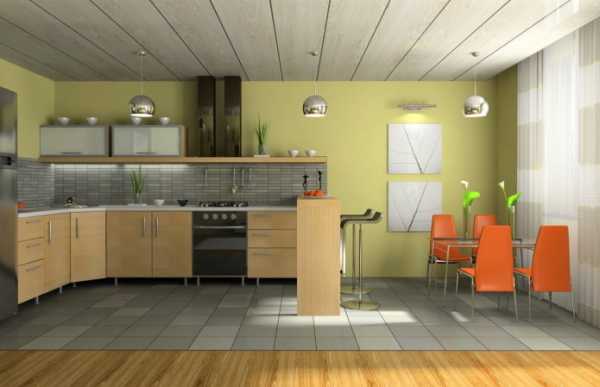 На фото деревянные МДФ панели на потолке в интерьере кухни.