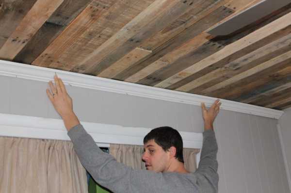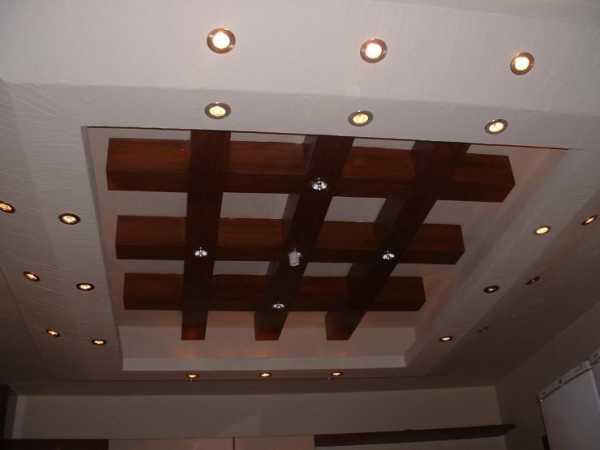 - Рельефные деревянные потолки дают простор дизайнерской фантазии: очень своеобразный получится рисунок от наклеенных колотых брусков длинной до 2 см. Кстати, ими можно незаметно закрыть неровности потолка, прикрепив их прямо к старому потолку или обрешетке.