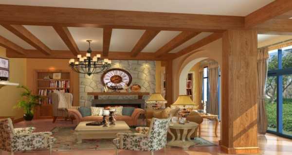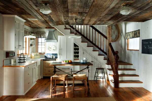Деревянные потолки в деревенском стиле улучшит тонирование или обработка пропитками, декоративными лаками, что визуально превратит обыкновенную древесину в дорогие на вид породы.