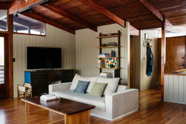 На фото гостиная в светлых тонах с деревянным потолком, украшенным балками.
