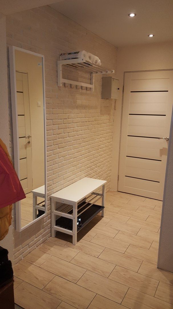 Если в малогабаритной прихожей нашлось место для скамейки, и обувь надевать можно сидя — это хорошее решение. В остальных случаях одна стена всегда будет под усиленной нагрузкой, потому что на нее придется облокачиваться. Желательно отделать эту часть декоративным камнем, рейками, прочной штукатуркой, моющимися обоями и другими материалами, устойчивыми к механическим повреждениям и повышенной влажности.