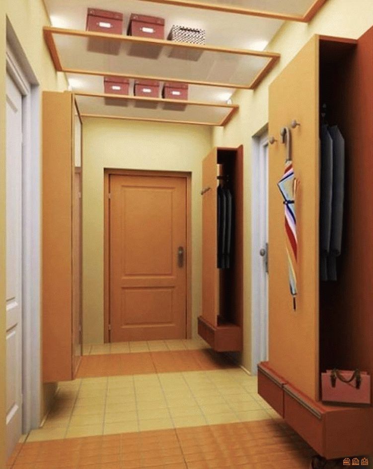 Коробки для обуви со складными контейнерами глубиной до 17 см удобны в этом смысле. - Длинный коридор, проходящий через все комнаты, не обязательно должен иметь стиль и внешний вид всего коридора.Найдите в коридоре функциональную территорию входа и хранения одежды.