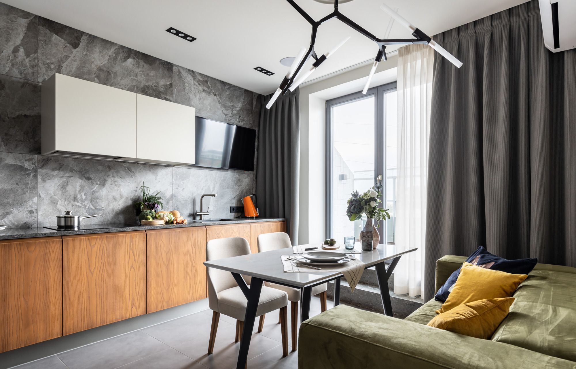 Обязательно присутствие современной встраиваемой техники. Замена стандартного обеденного стола барной стойкой уместна. Присутствие штор на окнах не обязательно. Текстиль можно заменить современными жалюзи или рулонными шторами.