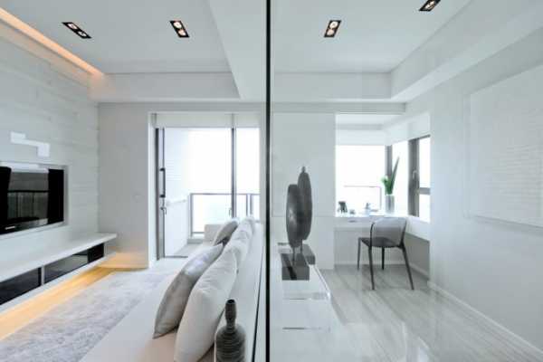 На фото перегородка, изготовленная из стекла в интерьере квартиры-студии.