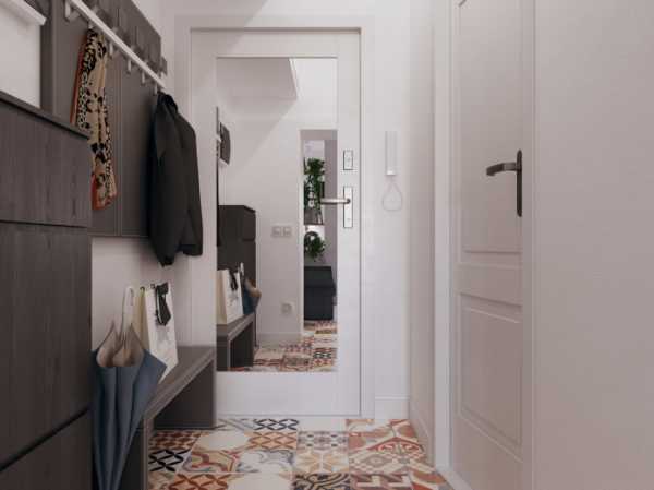 Основной декоративный акцент в прихожей – половая плитка с геометрическим орнаментом. Пестрая фактура напольного покрытия не только украшает интерьер, но и делает менее заметными следы от уличной обуви, которые неминуемо остаются в холле. Вместительный шкаф-купе со светлыми дверцами выполнен на заказ, потому идеально вписался в нишу. Стены облицованы практичным и недорогим белым кирпичом, делающим прихожую визуально просторней.