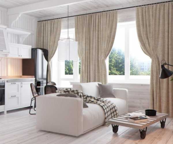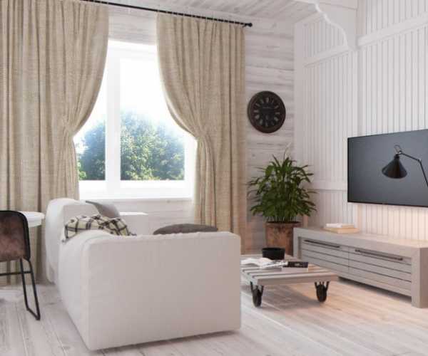 В последнем примере кухню, оборудованную столом-трансформером, отделили от гостиной белым диваном, а в отделанную деревом нишу поместили большую кровать. Светлая палитра, лёгкие шторы на окнах и правильно подобранная мебель позволили визуально увеличить объём помещения.