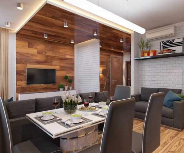 - Для потолка наиболее уместно использование гипсокартона или штукатурки. Из гкл получается сконструировать привлекательную многоуровневую потолочную конструкцию со встроенными светильниками для зонирования пространства.