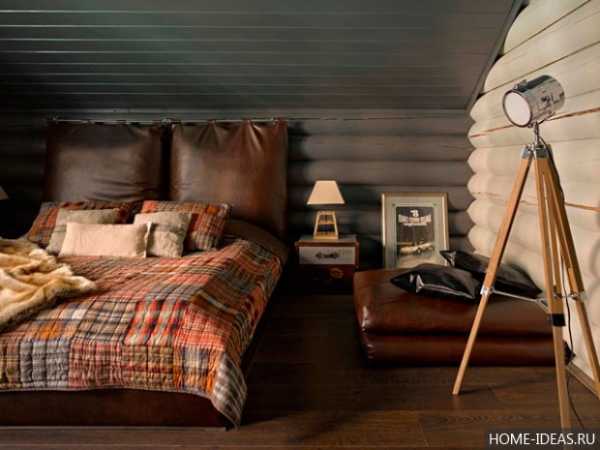Интерьер спальни, выполненный в стиле русской деревни.Выбирая этот стиль, можно воплотить интерьер согласно обычаям любой народности или же имитируя их атрибуты, кровать, тумбочку, светильники и другие предметы, находящиеся в комнате. Для того чтобы подчеркнуть причастность к тому или иному образу народа мира в интерьере, часто применяется мебель с традиционными орнаментами и рисунками, картины с фольклорными сюжетами, скульптуры и бытовые предметы в качестве сувениров.