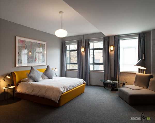 Для того чтобы выдержать стиль модерн в спальне, стены нужно покрасить в ровный однотонный цвет, на фоне которого будет хорошо смотреться цветовое разнообразие мебели и других элементов декора.А также обязательным элементом является минимальный набор мебели в помещении. Интересный вариант интерьера в стиле модерн — это сочетание светлых серых стен и правильно подобранной нестандартного оформления кровати, напольного покрытия и минимального набора для освещения.