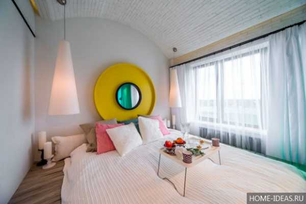 Спальня с одним окном | В том случае, если в многофункциональной комнате есть единственное окно, рекомендуется организовать спальное место рядом с ним. Кровать не должна стоять слишком близко к окну, ведь яркое солнце и сквозняки не способствуют созданию нужной обстановки. |