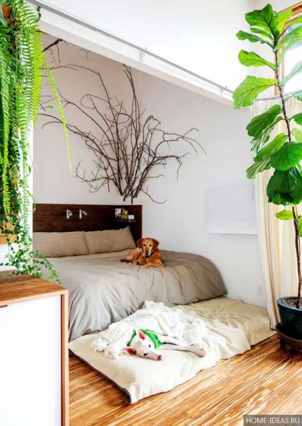 - Удобный вариант — кровать без ножек, она зрительно делает комнату чуть выше.