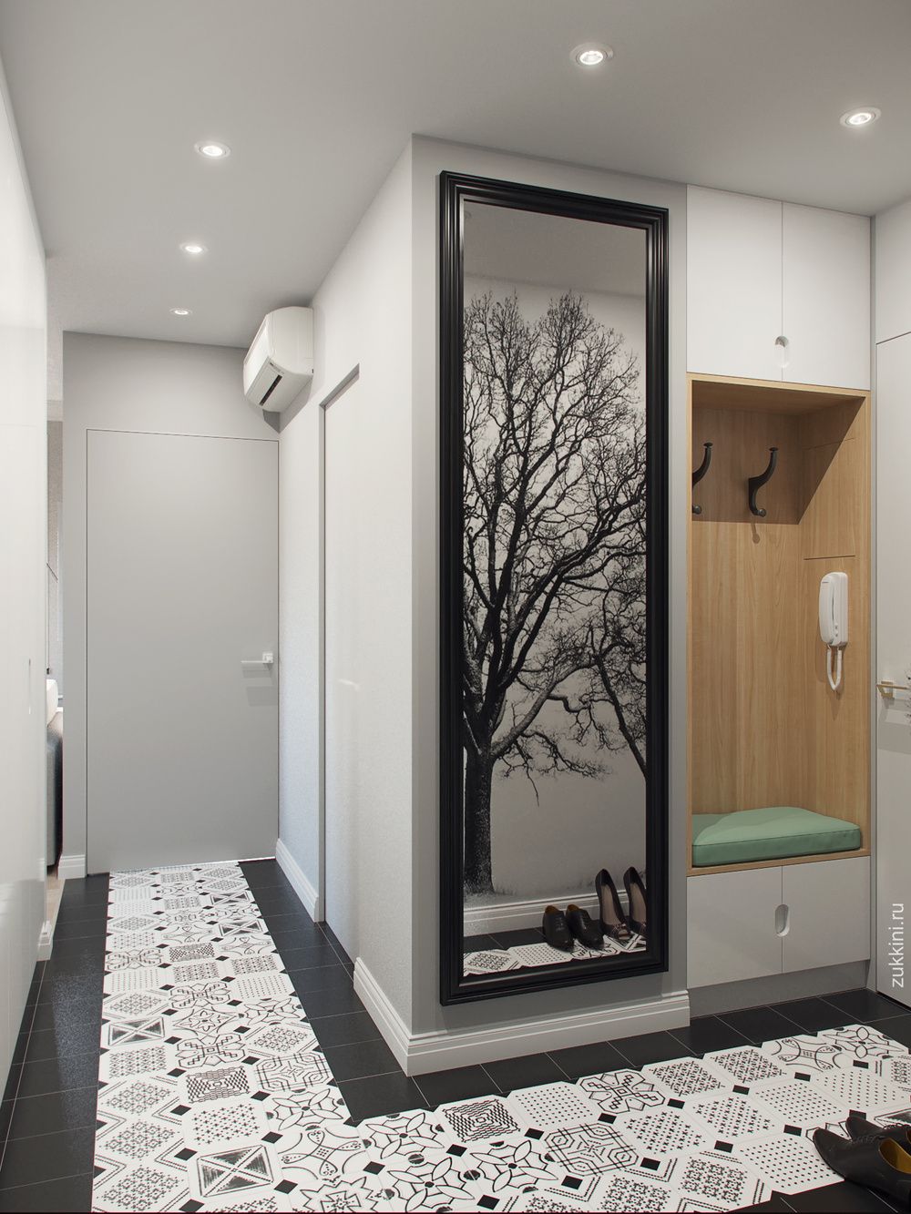 - Если в начале коридора находится входная дверь в квартиру, то помещение можно разделить на входную зону или прихожую и коридор.