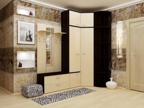 Необходимым элементом в прихожей также является пуф. Сидя на пуфике можно комфортно обуваться. При выборе мебели, обращайте внимание на ее функциональность. Для квадратных помещений лучше выбирать модульный комплект.