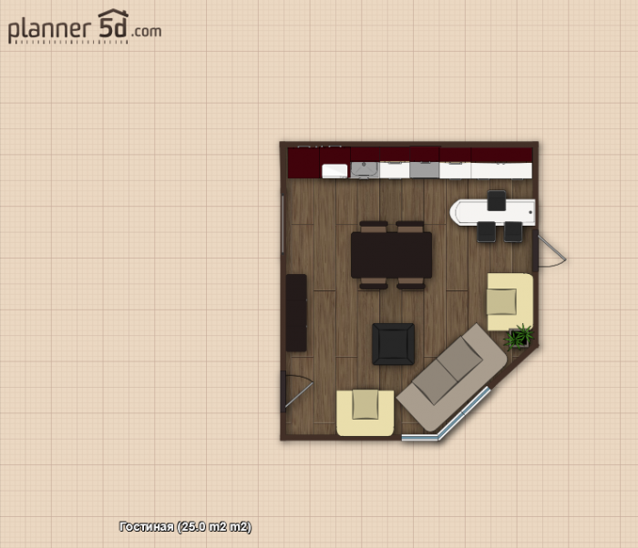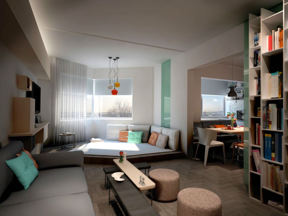 Например, на специально оборудованном подиуме нередко можно увидеть «столовую». Пол в «столовой» оформляется практичным материалом – паркетом, деревом, керамической плиткой, в то время как в гостевой используется более уютное покрытие – ковер.