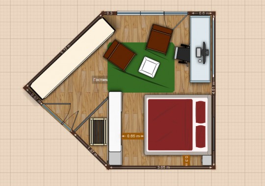 Как вы сами убедились, что даже для пятиугольной комнаты существует множество вариантов по её обустройству и подбору мебели. Если всё грамотно выполнить, то я думаю, что такая нестандартная планировка будет некой изюминкой для вас и будет удивлять ваших гостей.