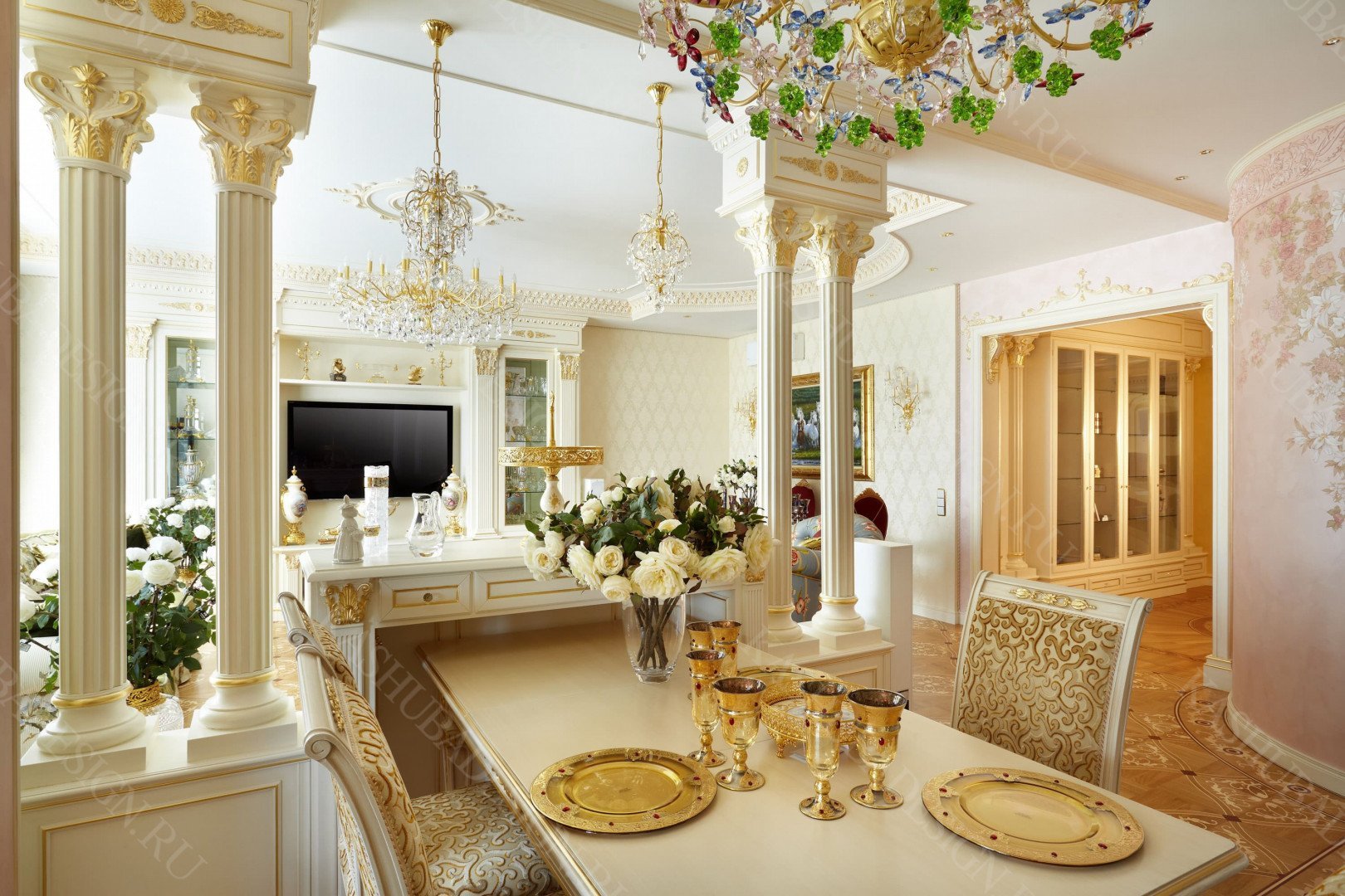 Дизайн в дворцовом стиле использует характерные отделочные и декораторские решения: