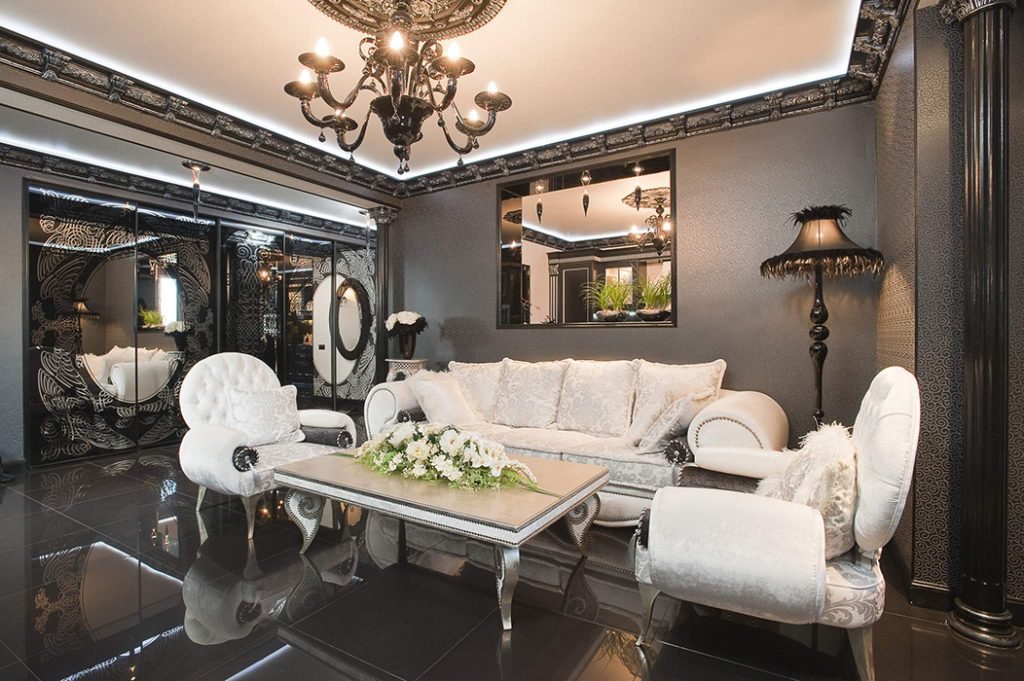Роскошный интерьер гостиной выдержан в светло-серых тонах с энергичным контрастом в виде почти черной деревянной мебели и ковра в центре помещения. Стены, потолок и пол создают нарядный нейтральный фон, поддержанный глянцевой и зеркальной отделкой. Стены в комнате облицованы лакированными квадратными плитами, на главной стене они комбинируются с зеркальными панелями.