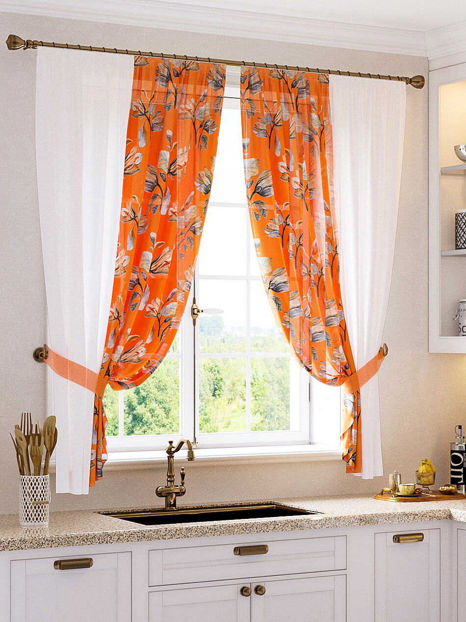 Если под окном размещены столы и другое оборудование, то выбирайте короткие шторы на кухню. Достаточно сделать вверху ламбрекены или задрапировать полоску ткани в виде волана. Если пространство оконного проема свободно, используйте полотно до пола из гипюра, шифона, газа с растительным рисунком и драпировкой волнами. По бокам красиво перехватите шнуром или лентой.