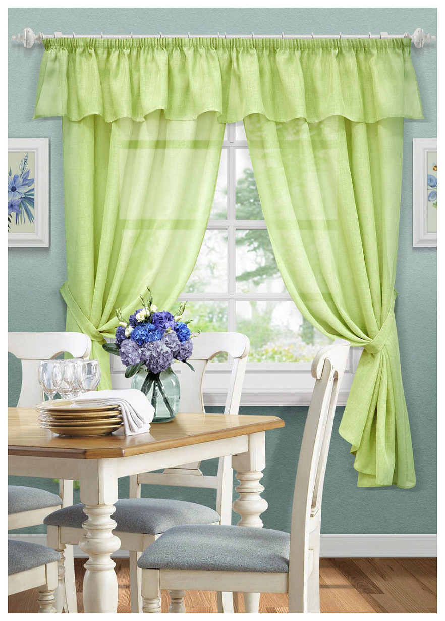 Выбирая шторы на маленькую кухню, обратите внимание на светлые занавески. Нежный голубой, салатовый, жемчужный – они сделают любую кухню привлекательной. С помощью небольшого ламбрекена модель можно разнообразить.