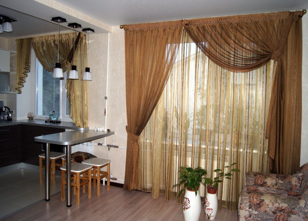 Кухня-гостиная на два окна в стиле минимализм: гардины классического кроя, портьеры — японского типа