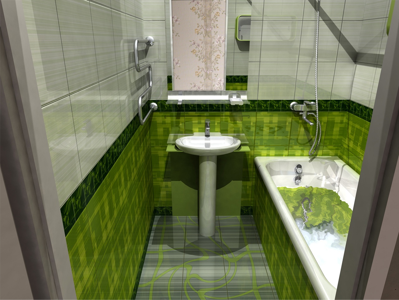 Свежие салатные оттенки — популярный тренд в современном дизайне ванных, красиво смотрятся в сочетании с цветочным дизайном.