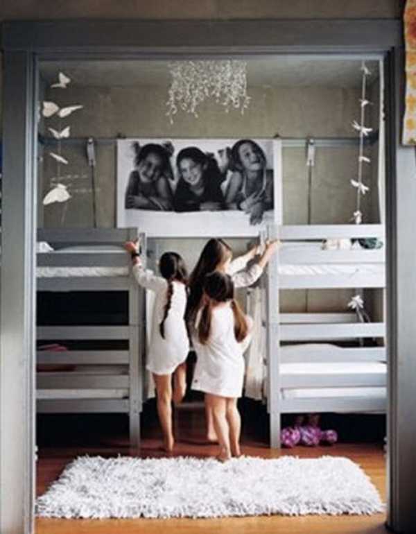 Интересный дизайн спальни для маленькой принцессы.Если разница у девочек большая, не стоит оформлять комнату в ярких тонах, лучше выбрать нейтральные стили и оттенки. Два спальных места по-прежнему должны быть, но для девочки-подростка это может быть кресло-кровать либо диван, не занимающие днем много места. Выберите для отделки стен светлые тона, а яркие акценты каждая расставит в своей зоне свои.