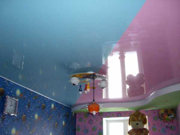 - На потолок можно нанести мягкие разводы розового, голубого или персикового оттенков. Также красиво смотрится цветной подвесной потолок.