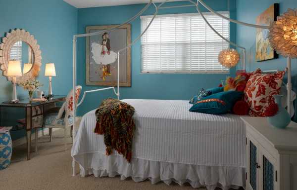 В спальне девочки подростка цветовая гамма будет зависеть от выбранного стиля: любительнице морских просторов, выбравшей средиземноморский стиль, понравится сочетание белого либо бежевого и синего. Полосатые стены и яркий текстиль создадут необычный интерьер.