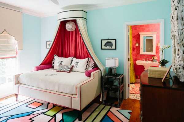 Для этого используйте технику декупажа на фасадах и зеркале, позаимствовав иллюстрации с книг. Кровать с балдахином, полихромное пространство, расцвеченное пестрыми узорами, благодаря спокойному фону абсолютно не раздражают. Сюжет ассоциируется с кукольным домиком, создает сказочную атмосферу, умиляет непосредственностью. Достаточно обойтись ролл-шторами на окнах, чтобы избежать отождествления со спальней.