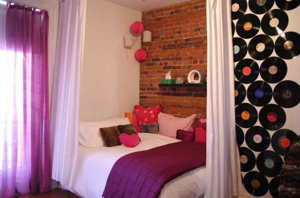 Аранжировка дизайна для взрослеющей рок-звезды, не подразумевает ничего сверхъестественного.Повесьте гитару, продублируйте ее форму на подушке.Оформите одну стену зеркальной плиткой, другую – блестящими дисками или винтажными пластинками. Сделайте для кровати подиум. Белая вертикаль стены, с идентичным воспроизведением нотной тетрадки, объединит замысел и позволит «музыкальной» спальне» стать уникальной.