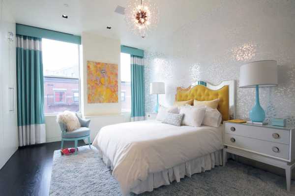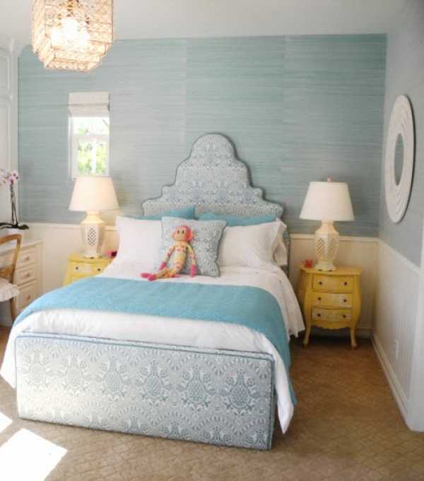 Если в спальню проникает много солнца, стоит обратиться к оттенкам лазури, бирюзы и бледно-синей гамме. Легкости и нежности можно достичь при сочетании светлых стен и их совпадением с такими же фасадами мебели. Активные световые потоки и воздушные кружевные занавески создадут дополнительный объем. Голубой отлично рифмуется с эффектными пятнами: розовыми и желтыми бабочками, с фоном светло-серых обоев с шелкографией, их металлическим отливом. Нежным колером стоит оформить всю комнату, использовать выборочно или задействовать только в текстиле.