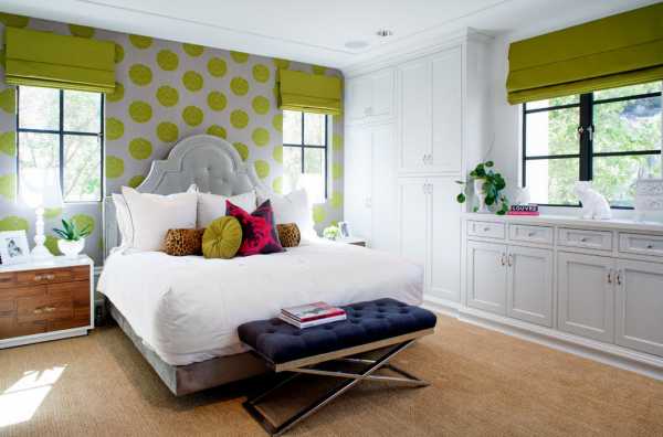Белое пространство комнаты отождествляется с легкостью и светом. Расставьте ударения мазками цветов из нежной палитры. Яркий цвет лазури или весенний травы, красочная имитации шкуры удачно пропишутся в ахроматическом пространстве. Для «невесомых» впечатлений повесьте на окна кисею или оформите проемы жалюзи. Предпочтение за флористическими темами на текстиле (от Caro). Стеклянный одуванчик над потолком сотнями искристых лучиков убедит в желании отдыхать в светлом пространстве.