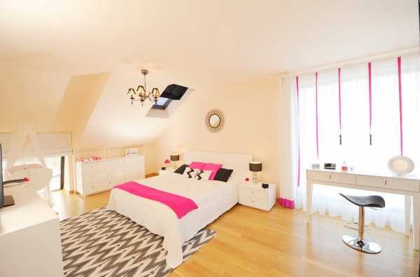 Розово-белая спальня для девочки.Привлеките девочку к созданию дизайна комнаты – пусть она расскажет, нарисует, какой представляет комнату своей мечты. Девочка постарше пусть поможет выбрать обои, покрывало на кровать, поможет оформить стены – рисунками, фотографиями. С подростком находите компромисс, даже если ей хочется создать свою комнату в стиле лофт. Самое главное при оформлении детской – комната должна нравиться самой девочке.