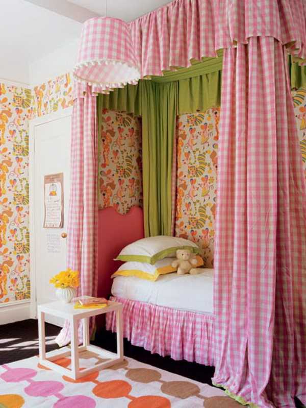 Красивое оформление кровати придает комнате оригинальность.Для девочки постарше, которая представляет себя принцессой, можно выбрать и розовые оттенки. Психологи считают, что розовый цвет символизирует нежность, женственность. Если вы согласны, что в дочке в первую очередь необходимо воспитывать эти качества, — выберите светлые тона – лососевый, светло-коралловый, цвет чайной розы. Теплые оттенки наполнят комнату светом. Серо-розовые, сиреневые создадут комфорт, добавят энергии. Такое оформление подойдет для комнаты девочки дошкольного и младшего школьного возраста.