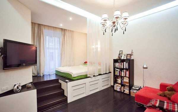 Оригинальным и практичным способом является размещение кровати на подиуме, причём по периметру её можно облачить в балдахин. Таким образом вы добьётесь не только визуального отделения зоны спальни от остального пространства, но и сможете заполучить в своё распоряжение дополнительные выдвижные ящики под ней в которые можно складывать постельное бельё и другие вещи.