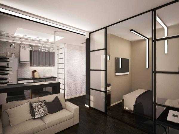 - Перегородка изготавливается из гипсокартона, других легких материалов, стекла. Перегородку можно использовать для превращения маленькой студии в полноценное двухкомнатное жилье. Такие перегородки очень легкие и не требуют разрешения на перепланировку, как в случае с демонтажем стен. Минусами выступают полумрак, возникающий в части без окон, чаще всего, спальном месте, а также тот факт, что их разрушение может занять некоторое время.