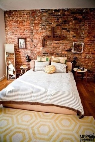 Если со всех сторон спальни вас окружают кирпичные стены, то разбавить монотонность можно при помощи шкафов, больших зеркал или картин. Это придаст комнате элегантность, а рельеф стен не будет таким утомительным.