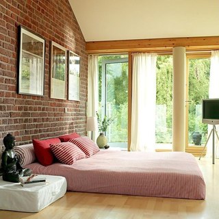 Если в спальне вас со всех сторон окружают кирпичные стены, разбейте эту монотонность гардеробными шкафами, большими зеркалами или даже размещенными на полу случайным образом произведениями искусства, которые отвлекут ваше внимание.