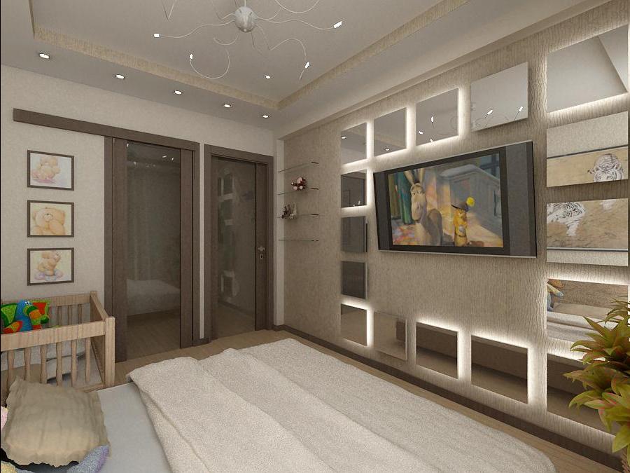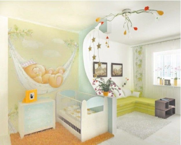 Когда малыш еще совсем маленький и вся его территория ограничена детской люлькой, зонировать комнату можно с помощью отделки и освещения. Оклейте стену возле кроватки цветными обоями, установите маленький ночничок. В крайнем случае, можно отделить кроватку легкой шторкой, чтобы ребенку не мешали блики работающего телевизора.