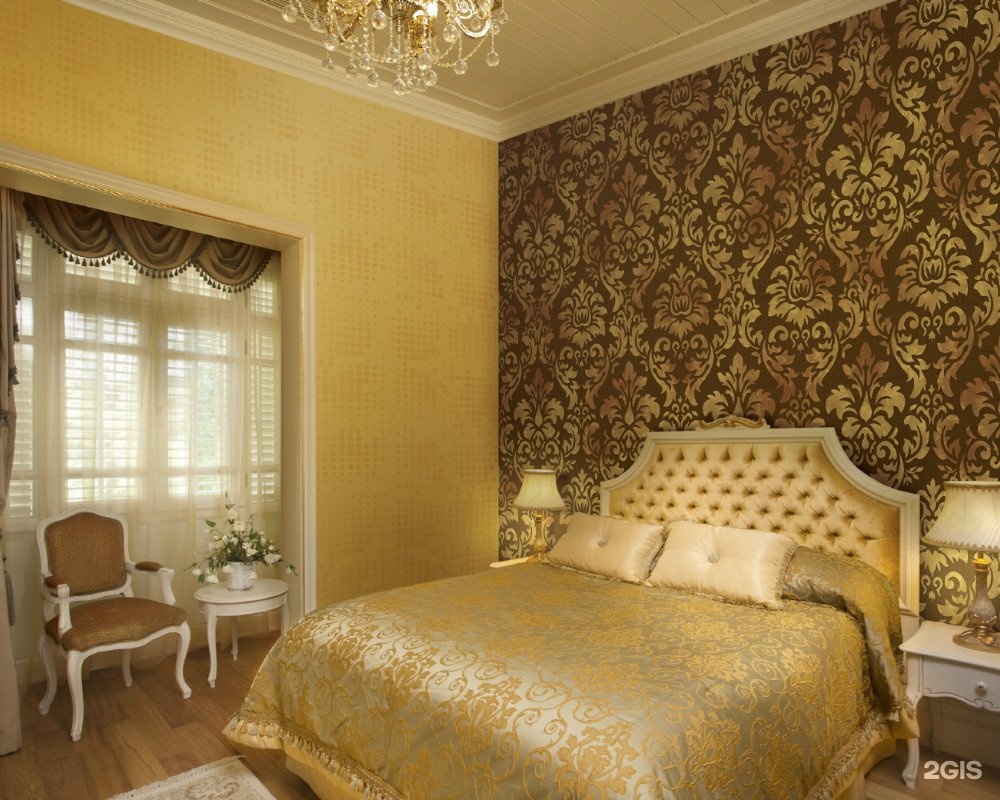 Для тех, кто желает использовать золотой цвет в интерьере по максимуму, стоит присмотреться к стилю арт-деко. Золотистые обои с принтом, соответствующим этому течению, сделают комнату торжественной и уютной одновременно, а плотная тяжелая портьера надежно защитит спящего владельца жилья от утренних солнечных лучей.