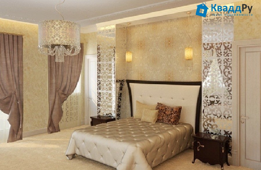 Элегантный текстиль с золотистым орнаментом впишется и в каноны классицизма. Беспроигрышным вариантом станет повторение элегантного орнамента постельного белья на легких полупрозрачных занавесках.
