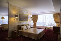Этот номер имеет нежный женственный вид. Редко можно ошибиться с сочетанием нежно-золотистого и серого помещения с кремовой мебелью.