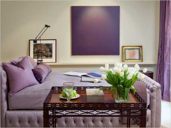 Получается очень нежной, навевает воспоминания о весенних цветах, отлично гармонирует с белым спальным гарнитуром. Сиреневый цвет можно обыграть в стиле Прованс, совместив его с приятными оттенками зеленого.
