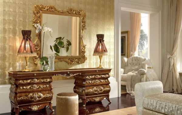 Для любителей неподражаемого стиля барокко можно оформить позолотой лепнину на стенах, люстры и шикарные абажуры, а также рамы для зеркал и дорогих картин.