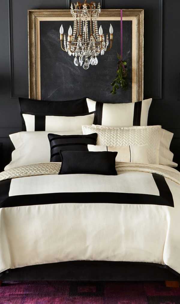 Черный и темно-коричневый идеально впишутся в интерьер спальни, если разбавить эти цвета частицей золота. Выгодно будут смотреться как мельчайшие вкрапления, так и отдельные детали (например, золотистые полосы на темных обоях или покрытие элементов мебели богатым цветом).