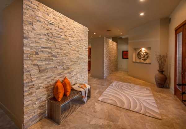 Весьма оригинально смотрится отделка стен камнем в прихожей. При этом можно осуществить укладку искусственного камня, как на всю поверхность стены, так и для отдельных участков с целью декорирования помещения. Для работы с этим материалом необходимо иметь идеально ровные поверхности стен.