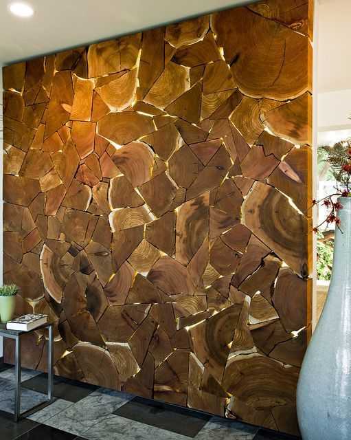 Для тех, у кого все в порядке с полезной площадью, будет любопытным взглянуть и на такие способы декора стен. Действительно, очень выразительные получились фото — и в который уже раз отметим ту лепту, которую вносит в восприятие того или иного декора организованное в комнате освещение.