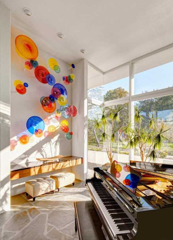 Декор стен стеклянными тарелками и картиной простым карандашом