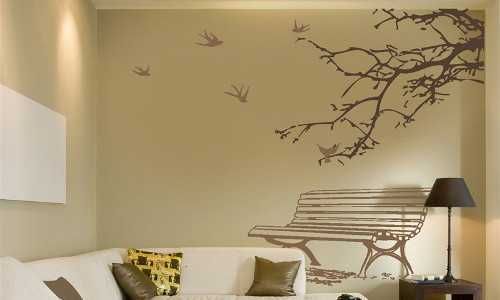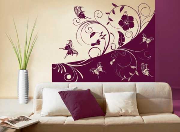 На бумаге рисуют контуры бабочек или цветов и вырезают. Если красиво нарисовать не получается, можно воспользоваться готовым трафаретом. Тщательно продумывают расположение и форму композиции и карандашом делают метки на стене. Затем каждую фигурку аккуратно приклеивают к поверхности, создавая нужный узор. В маленькой гостиной не стоит использовать большое количество аппликаций и заполнять ими все стены, в просторном же помещении сложный узор из множества мелких элементов будет вполне уместным.
